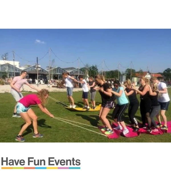 Huur het vliegend tapijt voor uw teambuilding, 6-kamp of sportdag. Het vliegend tapijt wordt per set van twee vliegende tapijten geleverd. Dit betekend dat twee teams tegelijk tegen elkaar kunnen strijden.